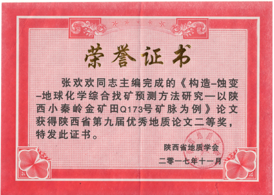 由我隊編制完成的“陜西省小秦嶺金礦田深部及外圍金礦整裝勘查區找礦預測與技術應用示范(原關鍵基礎地質研究項目)報告”獲陜西省第九屆優秀地質成果二等獎;該隊地質調查所張歡歡同志撰寫的“構造-蝕變-地球化學綜合找礦預測方法研究—以陜西小秦嶺金礦田Q173號礦脈為例”一文獲優秀地質論文二等獎。