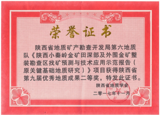2017年11月21日,陜西省地質學會下發了《關于陜西省第九屆優秀地質成果、論文獎勵評選結果的通知》(陜地發[2017]09號),公布了陜西省第九屆優秀地質成果、論文獎勵評選結果名單,共計30個項目獲優秀地質成果獎、20篇論文獲優秀地質論文獎。