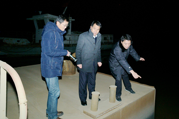 夜晚的黃河浮橋上冷風刺骨,氣溫低達-8℃。馬貴鎖指揮長與龐濤處長根據浮橋結構,研究部署攔截壩敷設方法。全體突擊隊員與渭南市、合陽縣環保局工作人員從大卡車上卸下鋼絲繩、扳手、鉗子、活性炭包等器材器具,隨時準備敷設攔截壩。