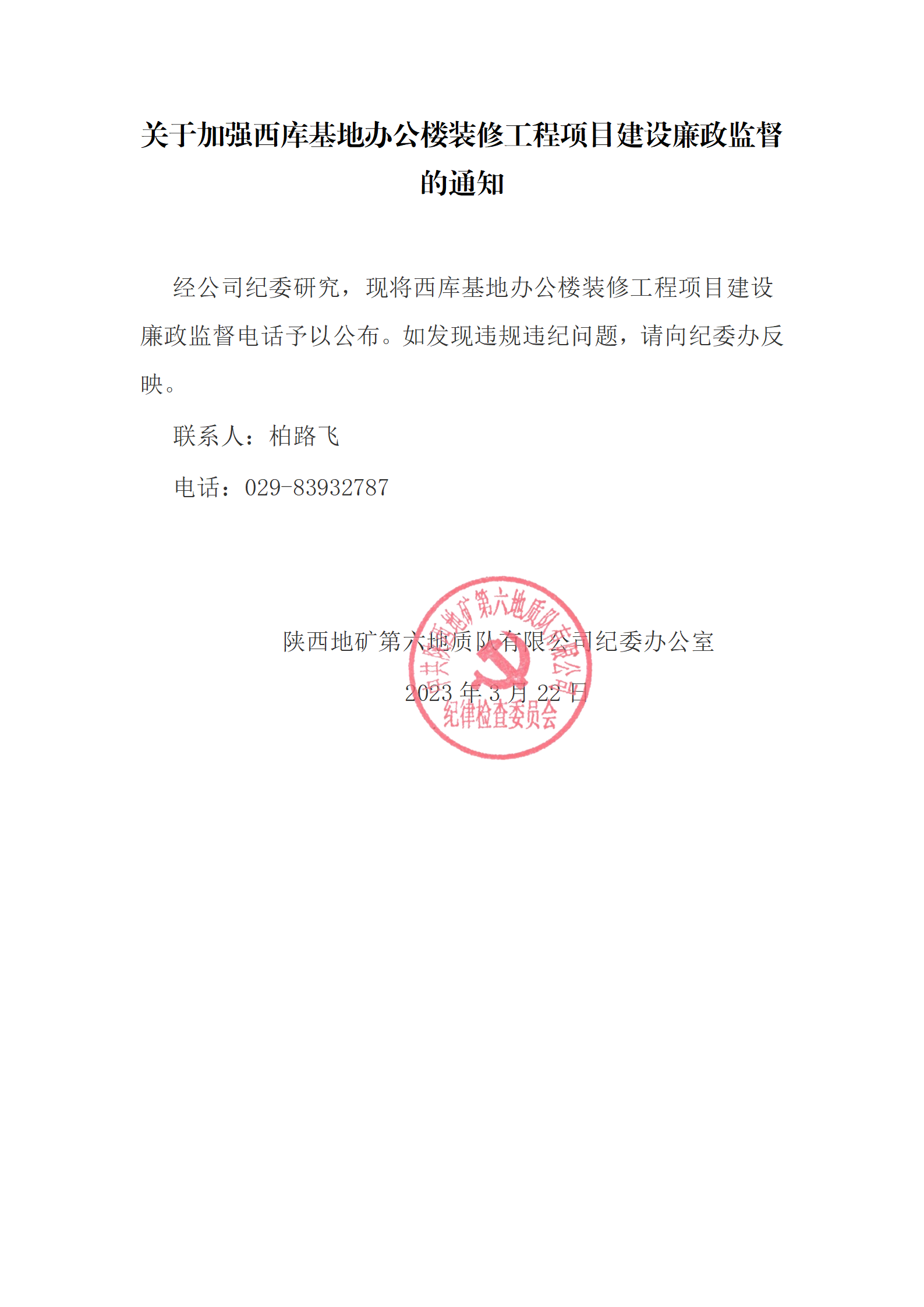 關于加強西庫基地辦公樓裝修工程項目建設廉政監督的通知