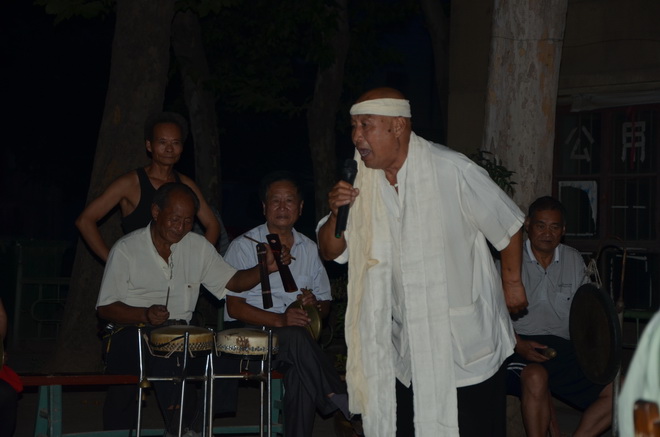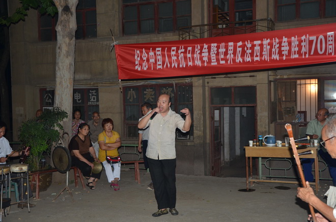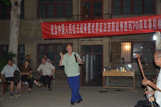 初秋的傍晚已現涼意,但代王隊部大門口卻響起了熱鬧的音樂聲,原來是隊離退辦組織離退休職工“秦腔自樂班”以唱秦腔形式紀念抗戰勝利70周年。閃光燈下,“紀念中國人民抗戰勝利暨世界反法西斯戰爭勝利70周年”橫幅赫然在目。8點15分演出正式開始。一折程老生的“大報仇”劃過夜空,成為晚會的首曲,緊接著是“青衣”、“花臉”輪番上場,正是你方唱罷我登場,場面熱鬧而有序,表現出了離退休職工高昂的愛國主義熱情和對和平生活的贊美之情。