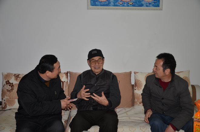 圖為工會主席夏元鵬、隊長助理王倉武慰問抗戰(zhàn)老兵郭振彥