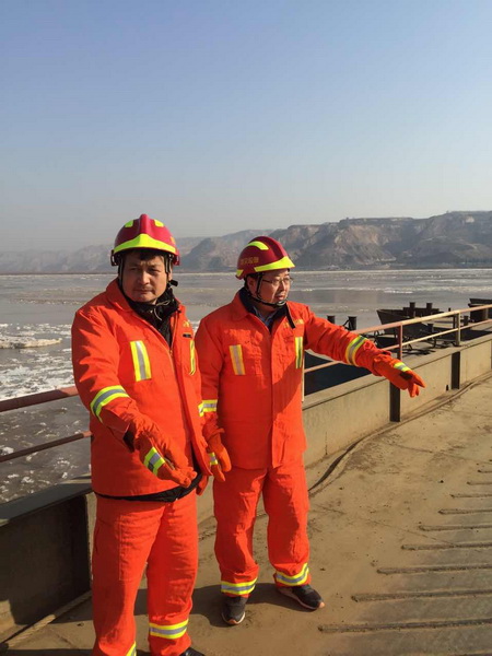 夜晚黃河橋冷風刺骨,氣溫低達-8℃。按照總隊制定的攔截壩敷設方案,劉曉東、王和平帶領突擊隊員頂著凜冽的寒風,與渭南市、合陽縣環保局工作人員一起搶卸卡車,將鋼絲繩、扳手、鉗子、活性炭包等應急器材器具迅速配送到位,隨時準備敷設攔截壩。所有人都在急切地等待著上游的監測結果。