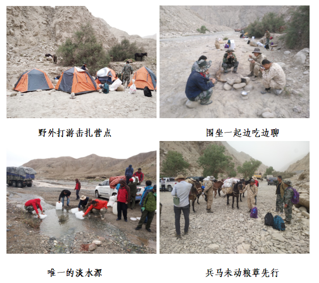 由于工區面積較大,采樣難度因地形所限超乎預期,許多地方不能當天返回駐地,我們只能采用“打游擊”(騾子馱帳篷,走哪住哪)的方式進行。于是茫茫阿爾金山便是我們的床,浪漫星空便是我們的被,與阿爾金山野驢為伴,別說還真有點野性。然而吃飯卻是最大的問題,自帶的淡水僅能維持兩日,后面的日子就只能用燒開的咸水煮方便面、下掛面,或者索性用馕充饑。為了能按時完成任務,項目人員餐風沐雨,齊心協力,從不叫苦。